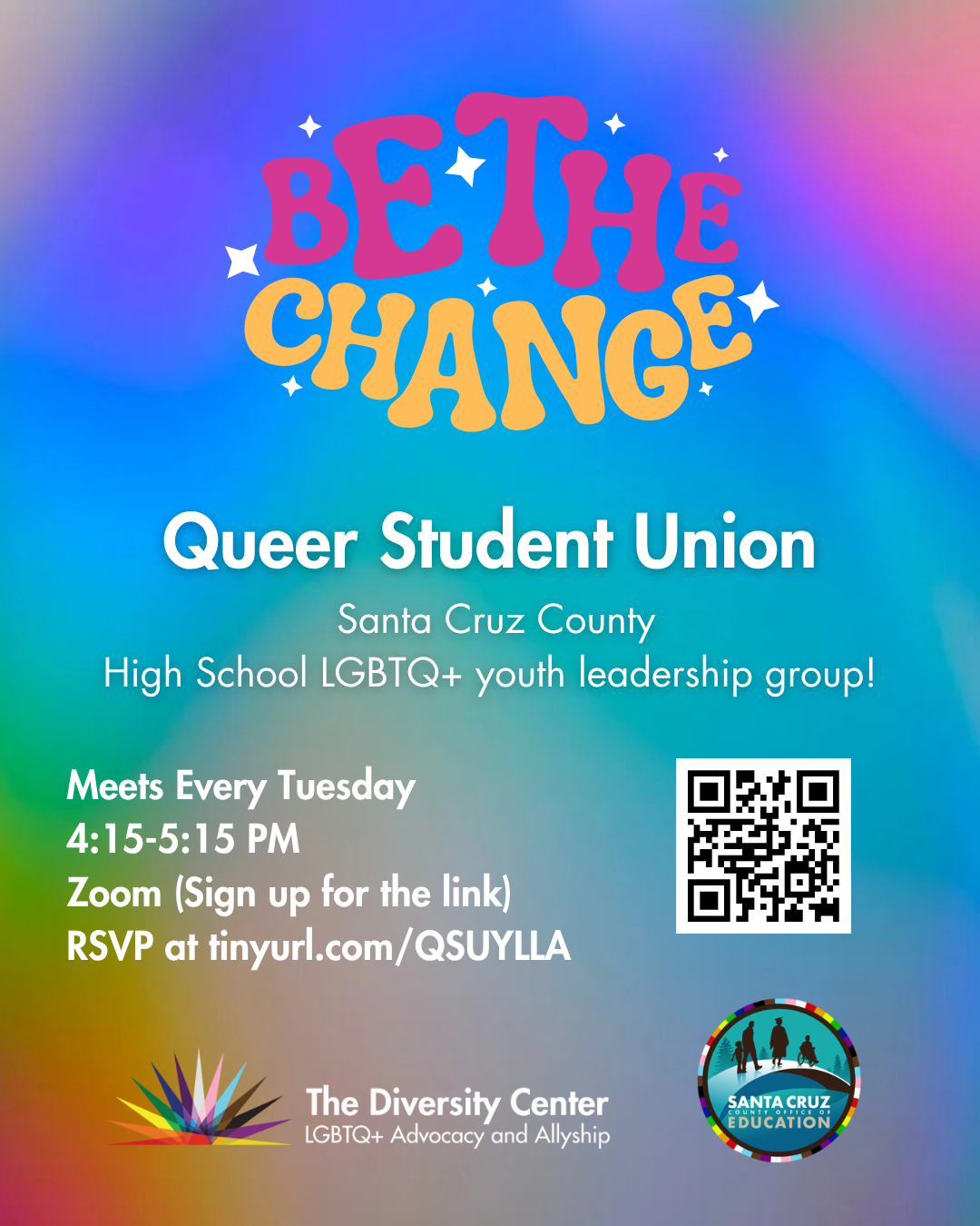 Queer Student Union (QSU) is a space for LGBTQ+ high school students across Santa Cruz County to connect, create, and lead. Whether you’re passionate about advocacy, curious about exploring Queer liberation, or just want to find community, QSU is where you can make your voice heard and your ideas come to life.  The Queer Student Union is part of the Youth Led Leadership Alliance, which is a network of 8 different leadership groups sponsored by the Santa Cruz County Office of Education working together to develop leadership skills and make an impact across their community.